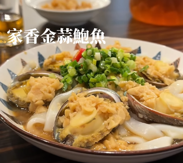 「家香金蒜鮑魚」底下還有吸飽湯汁的粄條,她吃了四顆。